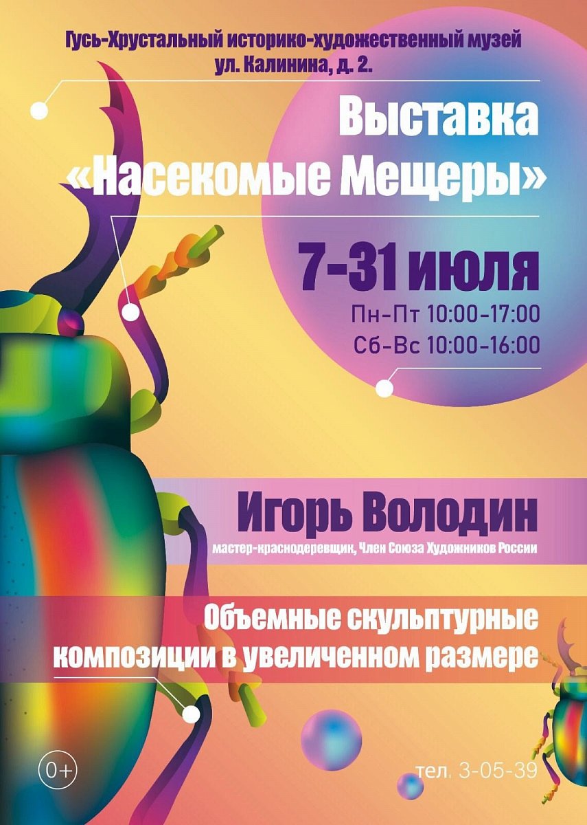 7 июля в 12:00 мы с удовольствием приглашаем жителей и гостей города на открытие выставки мастера-краснодеревщика, Члена Союза Художников России Игоря Вячеславовича Володина - "Насекомые Мещёры".